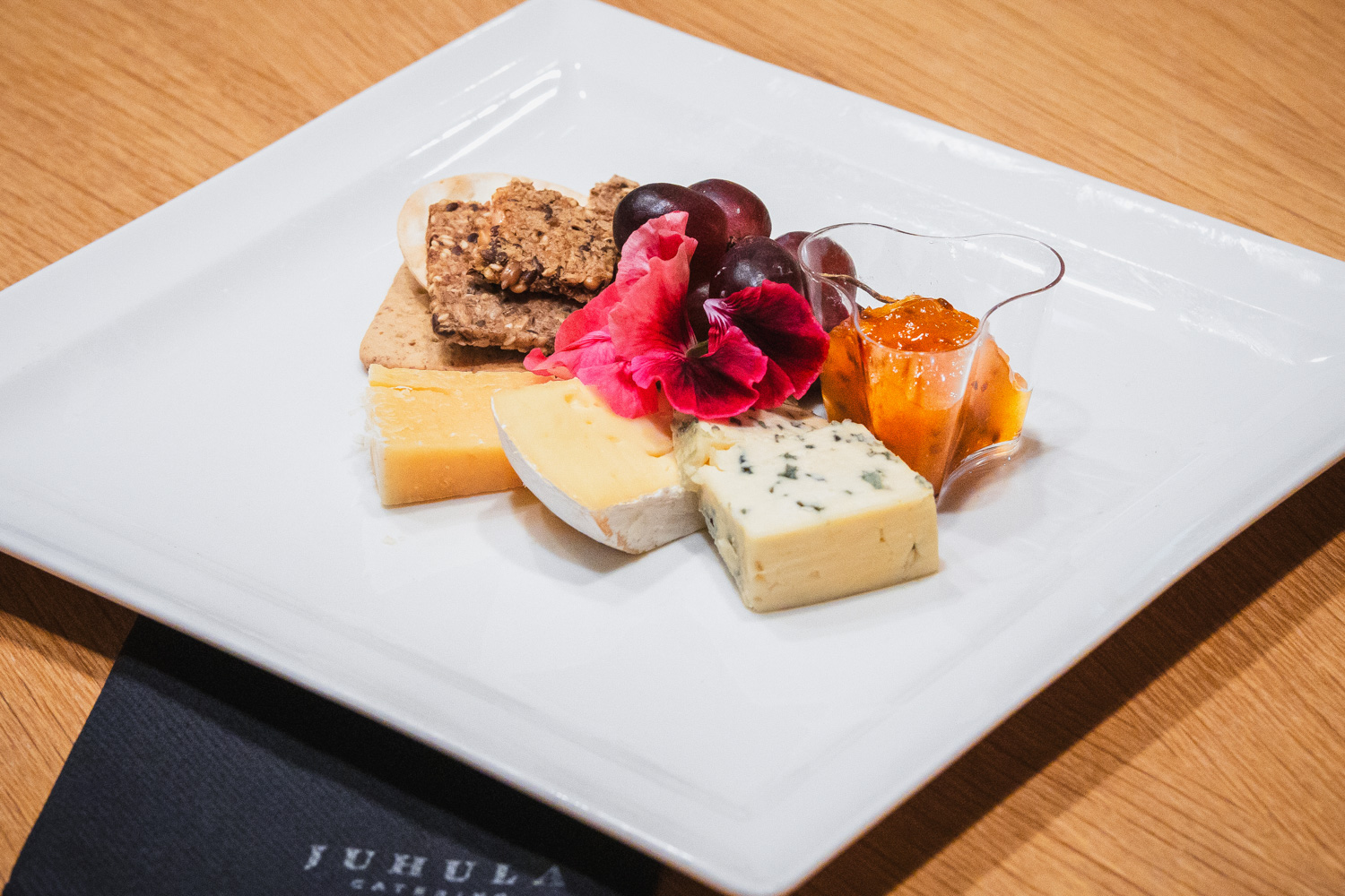 Sisältää valikoiman juustoja, erilaisia keksejä sekä hilloa ja viinirypäleitä.